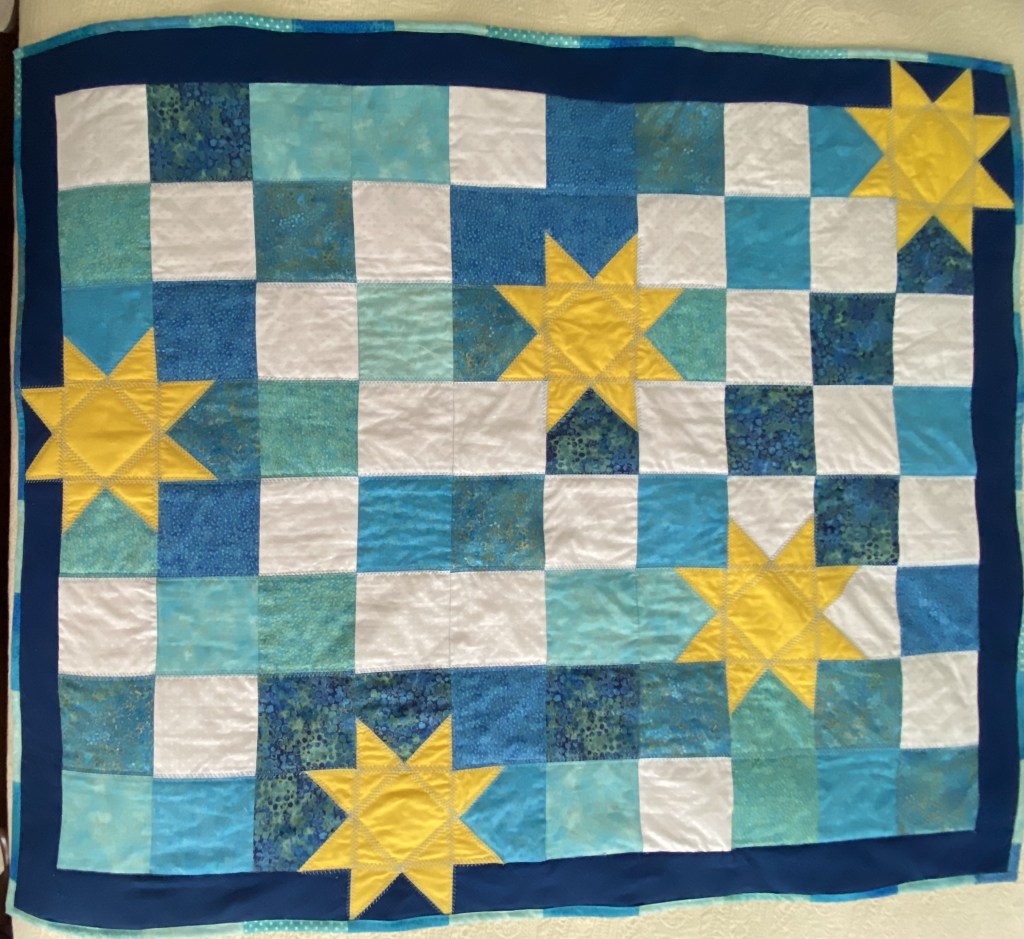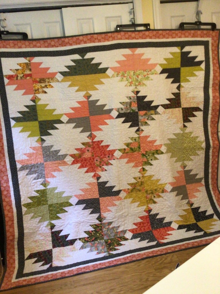 Grand Adventure made with warm tones with grey backing from a layer cake. Covers a king size bed nicely – 83 X 83 inches.