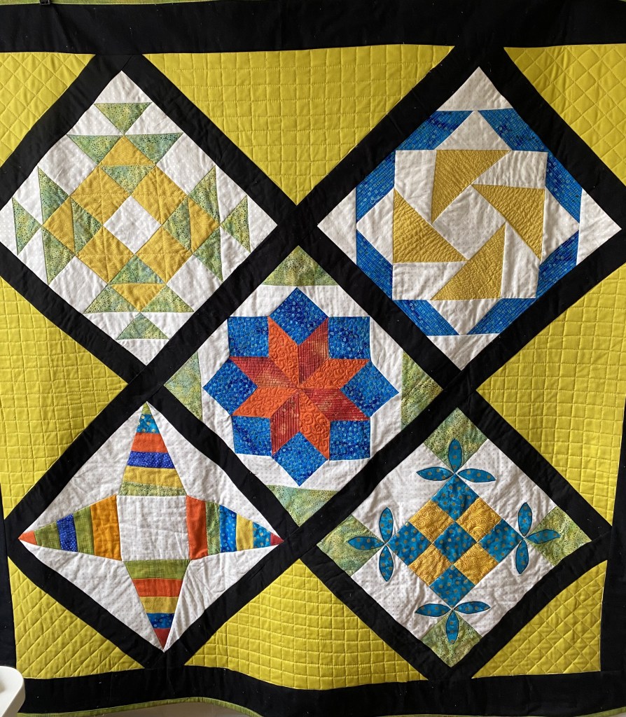 Historical Slavery Quilt – Squares from the “Underground Railroad .. Squares not normally done. On point with 15” squares. Christmas Star (1823), Chained Star (1850), Rocky Road ot Kansas (1887), Birds in the Air (1860-65 after civil war), Triple Link Chain (1938-linking families together). Cross hatched quilted. 55 X 55 inches