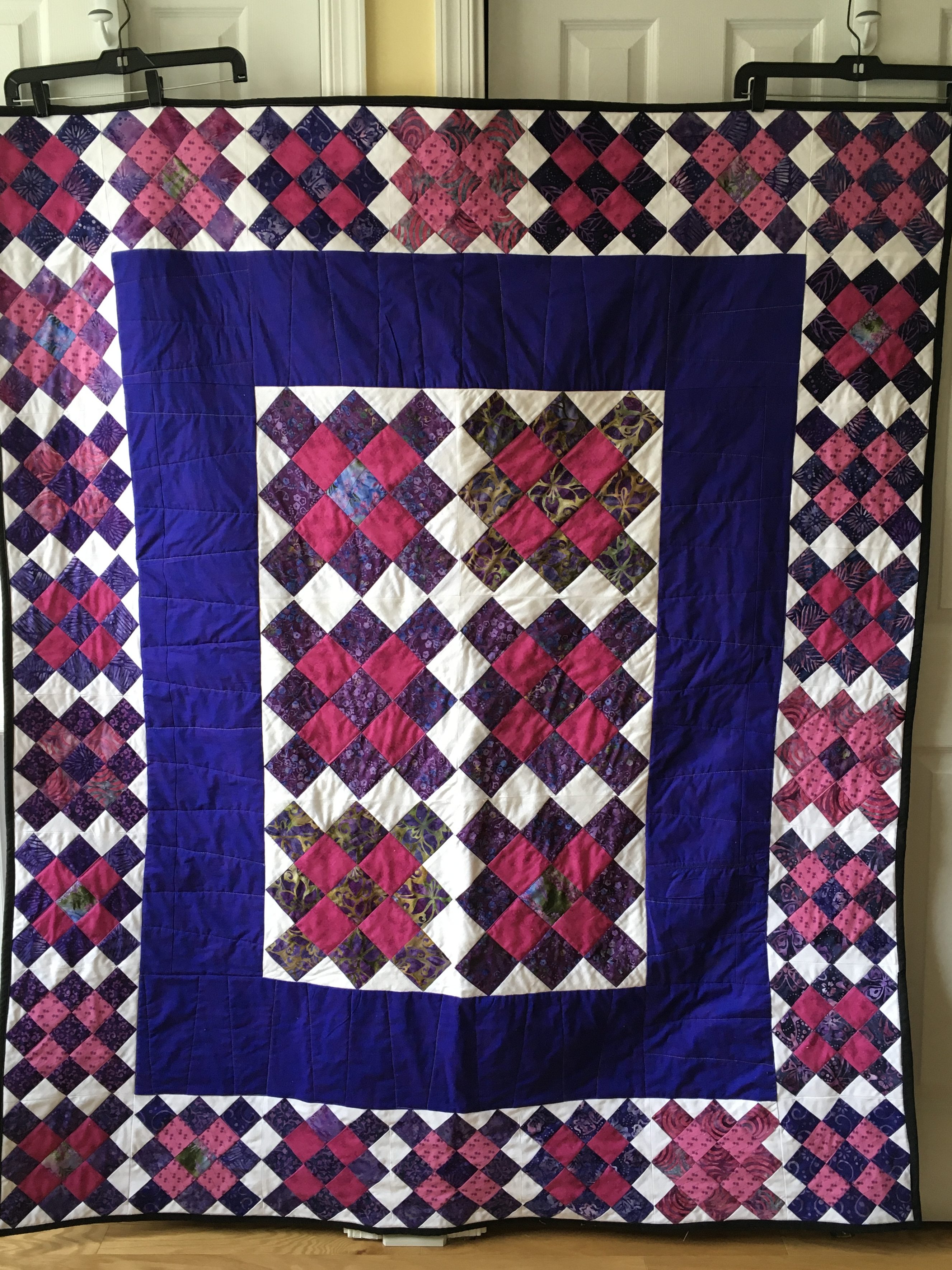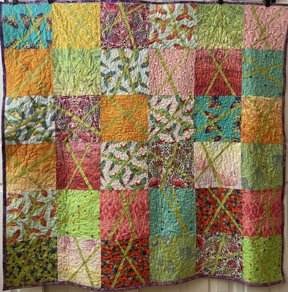 Chopped Layer Cake – Squares cut and sewn together and cut again – 47 X 66 inches.