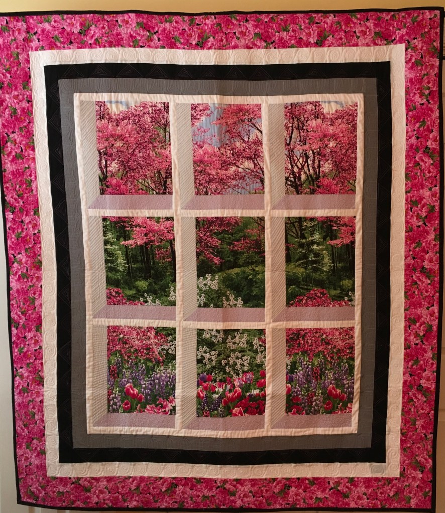 Spring Window Wall Hanging – 64 X 55. View of lovely spring flowers in pinks. Hours of free motion quilting.