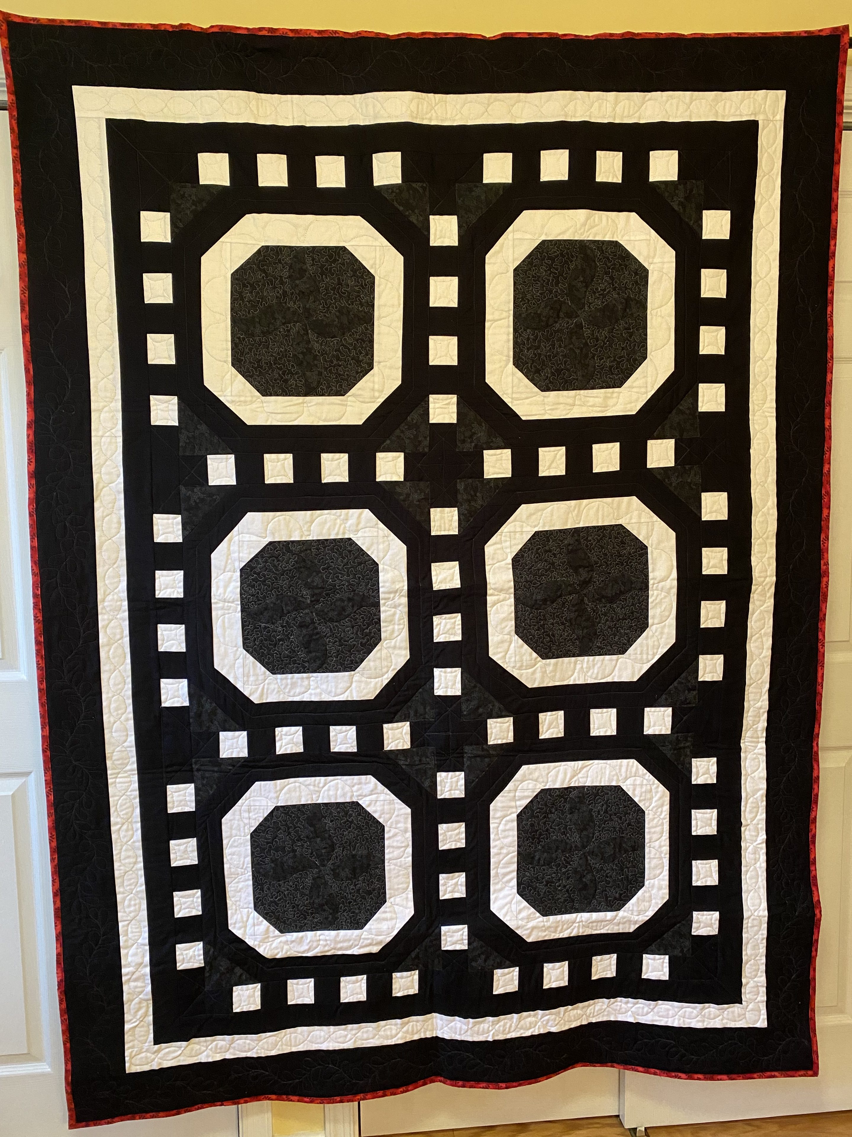 Black and White Tapestry – 57 X 57 inches, black & white backing and red binding, free motion quilted.