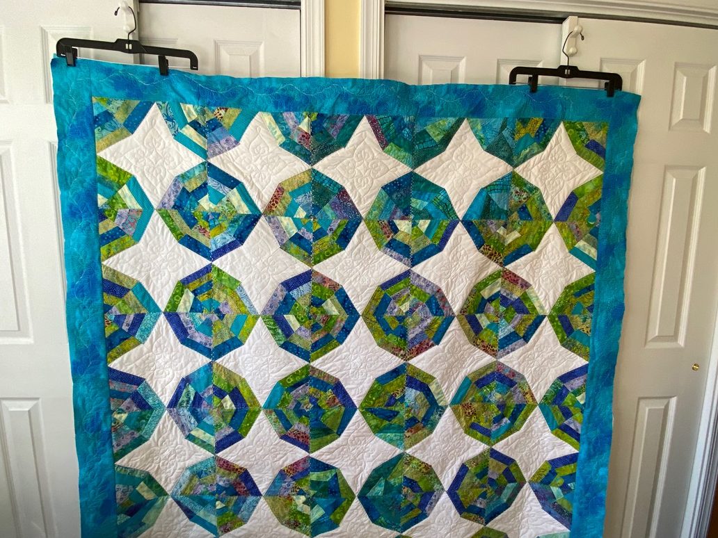 Wacky Spider Web made with scrappy blue green tones measures 66 X 66 inches. Stenciled free motion quilted.